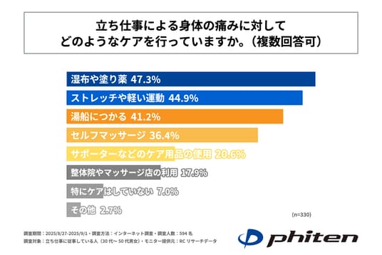また、立ち仕事が原因と考えられる身体の痛みを抱えていると回答した人を対象に「立ち仕事による身体の痛みに対してどのようなケアを行っているか」を尋ねる設問への回答では、1位が「湿布や塗り薬」で47.3%、2位が「ストレッチや軽い運動」で44.9%、3位が「湯船につかる」で41.2%という結果になりました。この結果から、立ち仕事による身体の痛みに対して行っているケアは、日常生活の中で手軽に取り入れられることが上位の回答に並ぶ形となりました。
