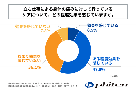 立ち仕事による身体の痛みに対して何らかのケアを行っている人のうち、4割以上の人がケアの効果をあまり感じられていない