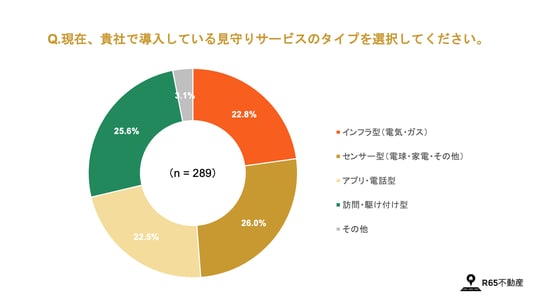 高齢者向け見守りサービスを導入済みの企業に利用しているサービスのタイプを聞いたところ、「インフラ型(22.8%)」「センサー型(26.0%)」「アプリ・電話型(22.5%)」「訪問型(25.6%)」がほぼ均等に分かれる結果となりました。