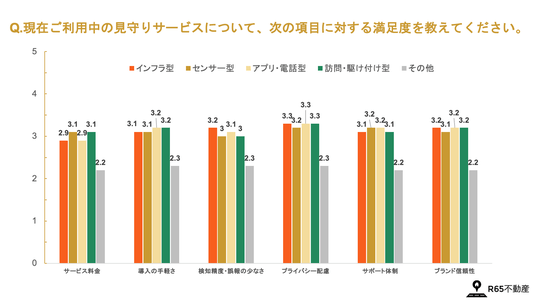 見守りサービスを各項目ごとに5点満点で評価いただいた結果、全体的には3点台前半で大きな差はありませんでした。その中で、インフラ型は「プライバシー配慮」で3.3点と全タイプの中で最も高く、センサー型は「サポート体制」で3.3点と相対的に優位な結果となりました。また、訪問型は「導入の手軽さ」「プライバシー」で比較的高め、アプリ・電話型は「ブランド信頼性」で3.2点と他のタイプよりも高めとなりました。