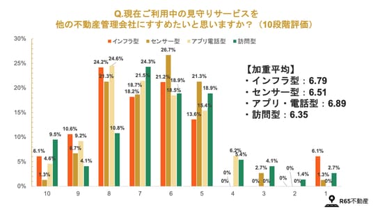 4.見守りサービスの他社へのおすすめ度合いは平均6.55点(10点満点)。「アプリ・電話型(6.89点)」や「インフラ型(6.79点)」が上位となるも大差なし。