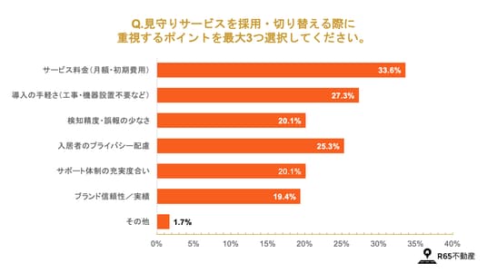 サービス導入・切り替え時に重視するポイントを尋ねたところ、「サービス料金(33.6%)」が最も多く、次いで「導入の手軽さ(27.3%)」、「入居者のプライバシー配慮(25.3%)」が上位に挙がりました。