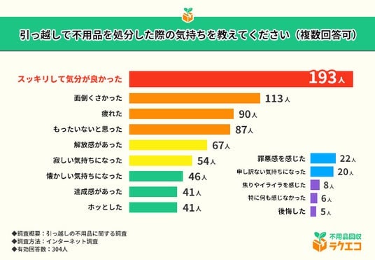 「引っ越しで不用品を処分した際の気持ちを教えてください(複数回答可)」と質問したところ、『スッキリして気分が良かった』(193人)が堂々の1位を獲得。2位は『面倒くさかった』(113人)、3位は『疲れた』(90人)となりました。