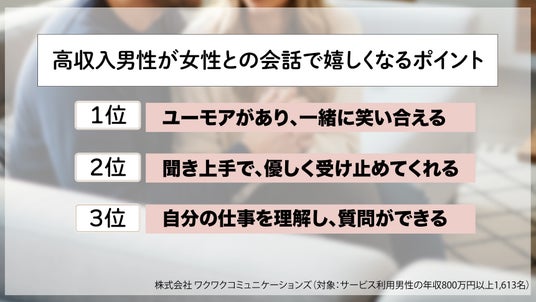 ~日本最大級の恋愛マッチングアプリ「ワクワク」が大調査!【高収入男性が「生涯のパートナー」に選ぶ女性の特徴】についてのアンケート結果~