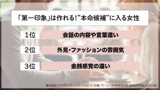 「生涯のパートナー」候補を、見分けるのに第一印象でどこを見るのかを質問したところ、回答の上位には「会話の内容や言葉遣い」「外見・ファッション」「金銭感覚」が挙がりました。