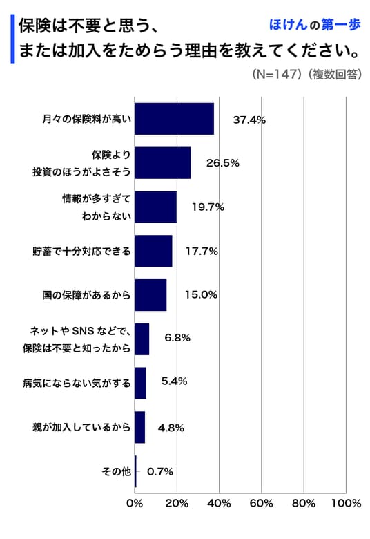 Z世代が保険は不要と考える、あるいは加入をためらう理由を調査したところ、1位は「月々の保険料が高い」、2位は「保険より投資の方がよさそう」、3位は「情報が多すぎてわからない」という結果でした。