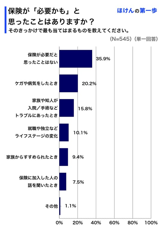 保険未加入者に対して、「保険が必要かも」と考えたことがあるかを調査したところ、約64%の人が必要かもしれないと思ったことがあると回答しました。そのタイミングは「ケガや病気をしたとき」「家族や知人が入院・手術などのトラブルにあったとき」が最も多く、実際のリスクに直面した際に保険の必要性を実感していることがわかります。