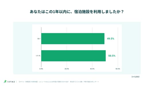 21歳~59歳の男女3,000人を対象に過去1年以内の宿泊施設利用状況を調査したところ、49.5%が「利用した」と回答し、50.5%が「利用していない」と回答しました。