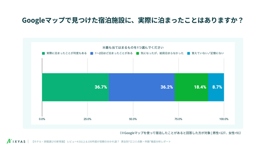 36.7%が「何度も泊まったことがある」、36.2%が「1~2回ほど泊まったことがある」と回答し、実に約7割がGoogleマップで見つけた宿に実際に宿泊しています。これらの結果から、MAP上での魅力訴求を強化し、検討から予約までの動線をさらに最適化することが重要であることがわかります。