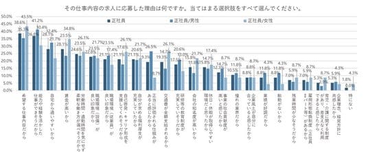 一方、「女性」のほうが「男性」よりも「交通費が全額支給されるから」が11.4pt、「賃金が高いから」が11.3pt、「会社の知名度が高いから」が9.9pt高くなった。収入面を重視して仕事探しを進めている傾向がうかがえる。