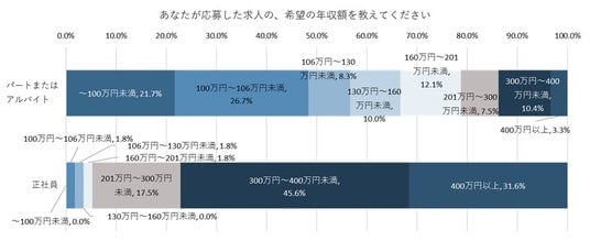 「正社員」を希望する人では、「300万円~400万円未満」が最多の45.6%、次いで「400万円以上」が31.6%、「201万円~300万円未満」が17.5%となった。300万円以上を望む割合が約8割のようだ。