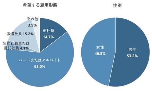 希望の雇用形態別にみると、「パートまたはアルバイト」では、「100万円~106万円未満」が最多で26.7%、次いで「~100万円未満」が21.7%、「160万円~201万円未満」が12.1%となった。106万円を超えない年収を目安にしている人の割合が約5割のようだ。一方で、201万円以上を希望する割合は約2割で、いわゆる年収の壁を気にせず収入を得たいと考える人も一定数いることがわかる。