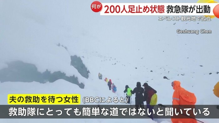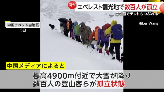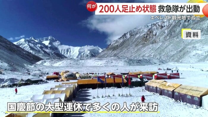 世界最高峰の山、エベレストが見える標高4900メートルのキャンプ地で数百人の登山者らが孤立している。大雪による積雪が原因で、当局が救助活動に向けた作業を始めているが、足止め状態の約200人とは連絡が取れているという。