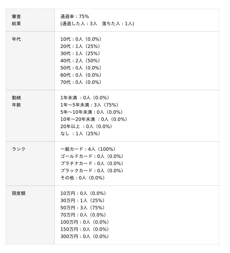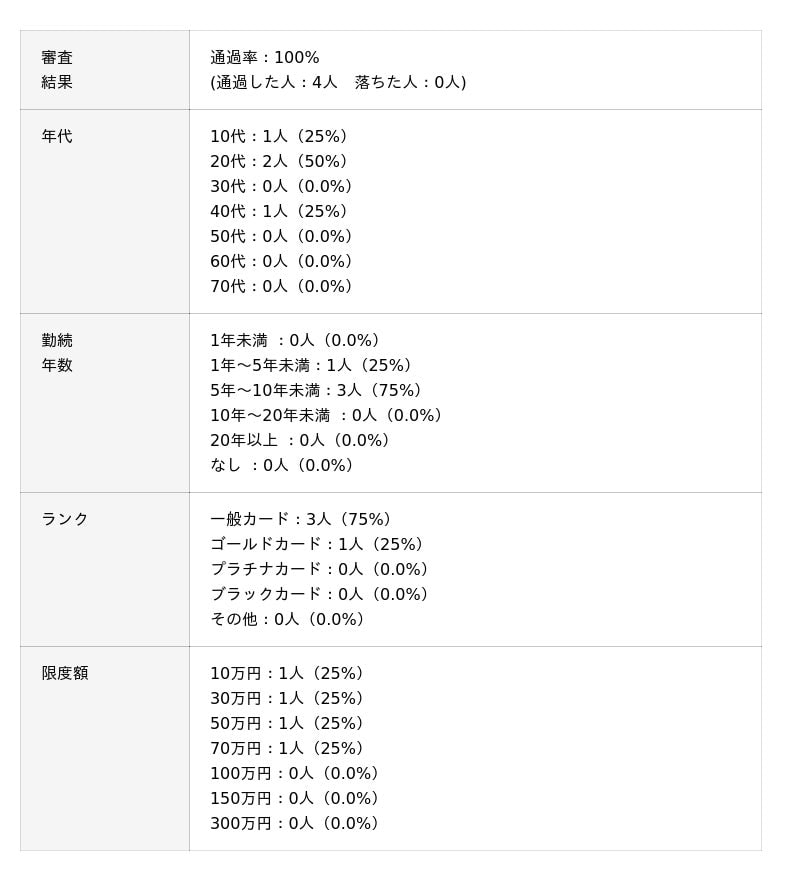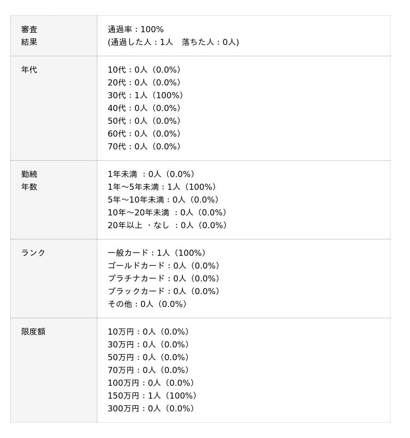 プロミスVisaカードの審査通過率は100%でした。審査に通過した方は勤続年数が1~5年以内で他社と差分はありませんが他社と比較して限度額が150万円と高い傾向がありました。