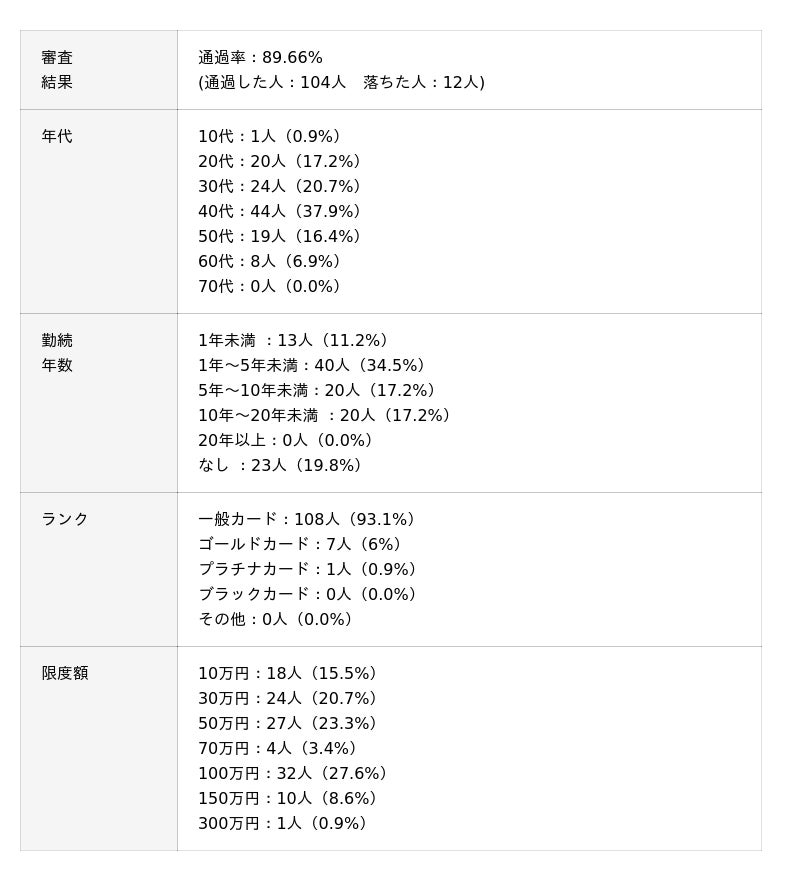 ACマスターカードの審査通過率は100%でした。審査に通過した方は勤続年数が1年以上で一般カードを選択している傾向がありました。