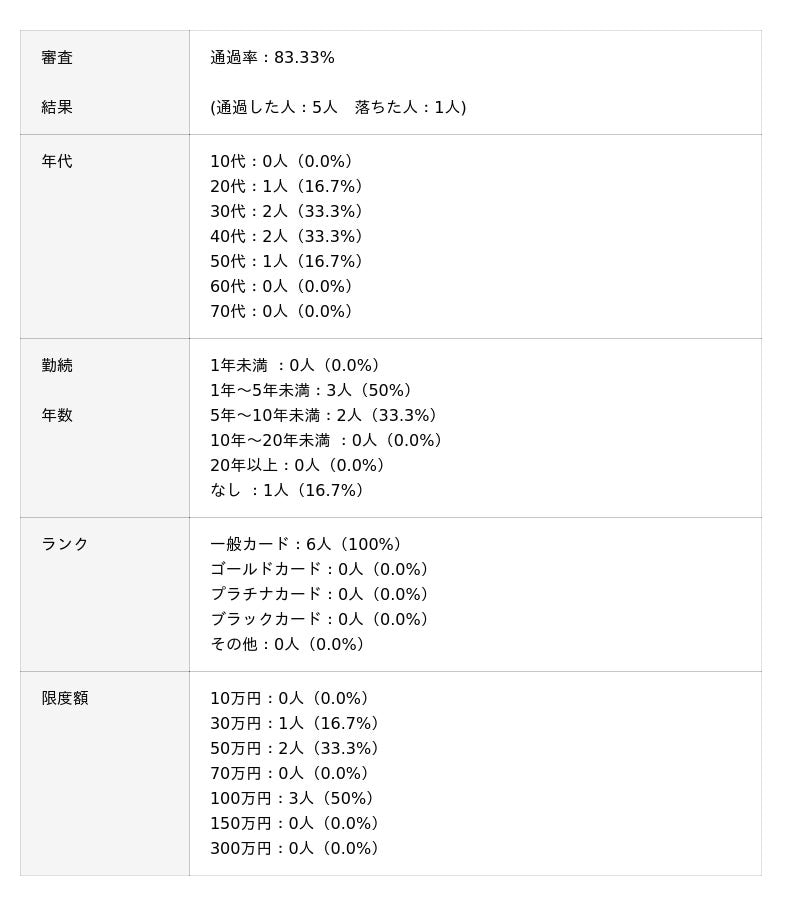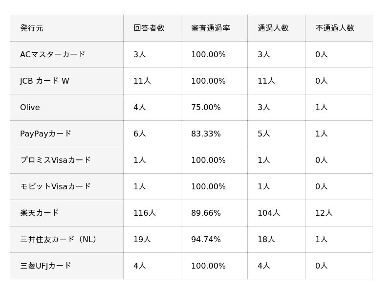※審査通過率は「通過人数 ÷ 回答者数」をもとに小数第2位まで算出しています。回答は自己申告に基づくものであり、各カード会社の公式データとは異なります。