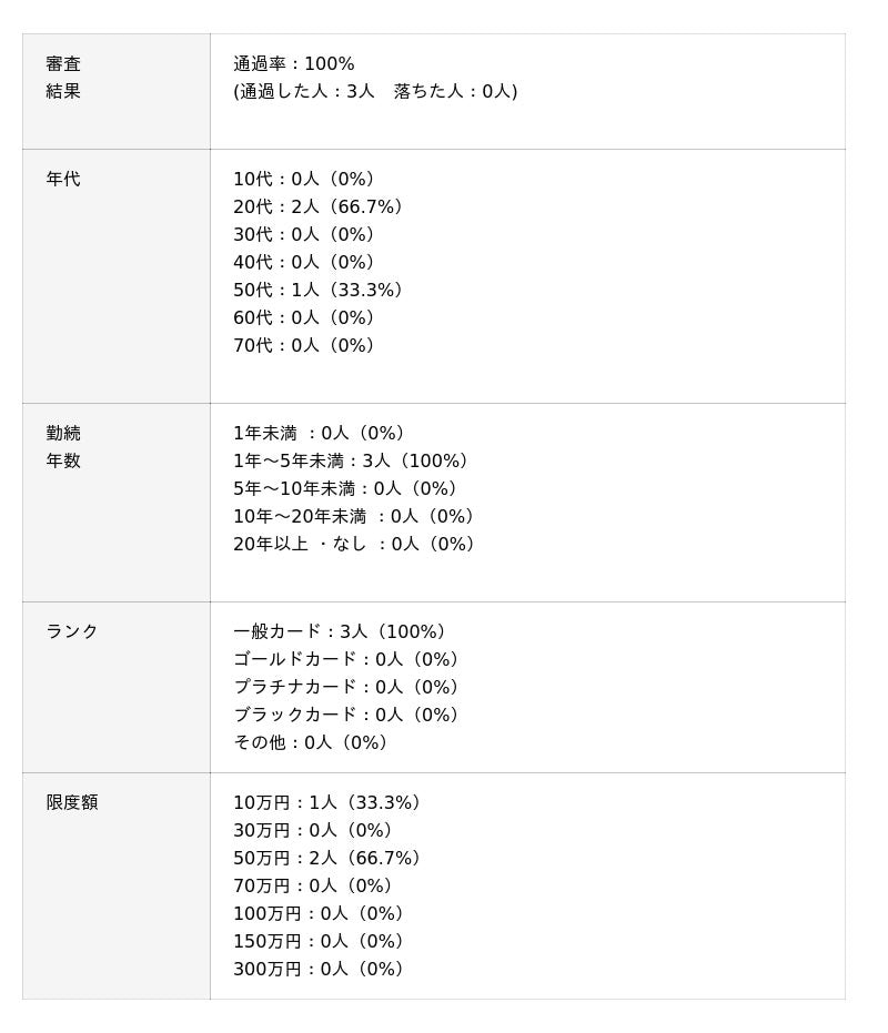 その他の方は限度額が100万円と比較的に高いものの勤続年数が長いことから審査に通過している傾向が見られました。
