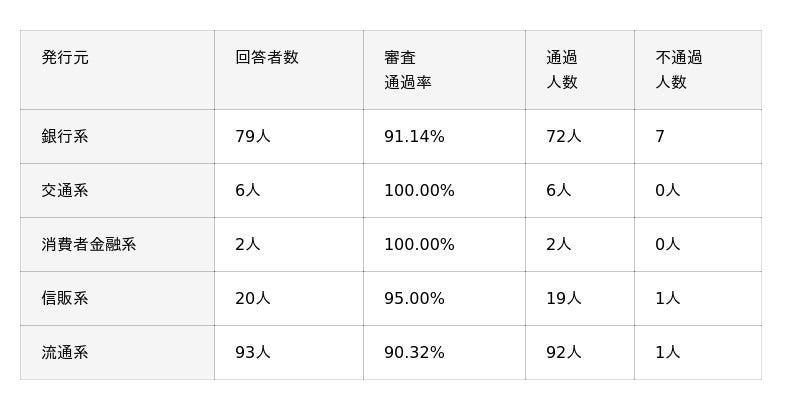 結果から、すべての発行元で審査通過率は90%を超えており比較的審査に通過した人が多い事が分かります。