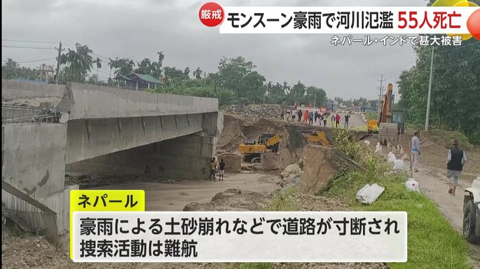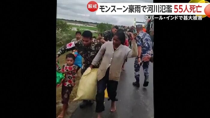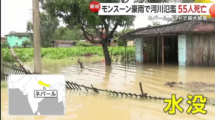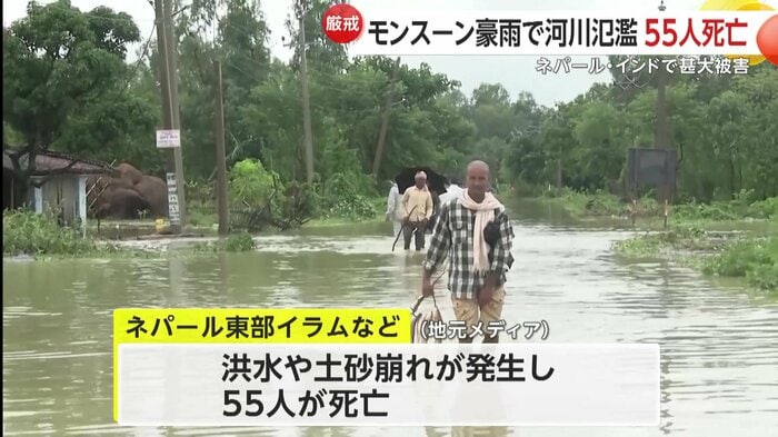 一方、ネパールではモンスーンによる豪雨に見舞われ、河川が氾濫し洪水や土砂崩れが発生し、55人が死亡したと地元メディアが報じている。