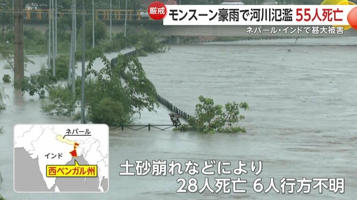 ネパールと国境を接するインド東部にある西ベンガル州でも、土砂崩れなどにより28人が死亡し、6人の行方が分からなくなっているということだ。