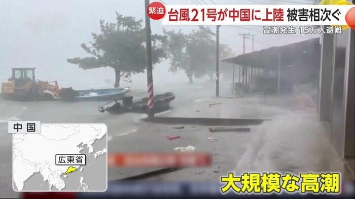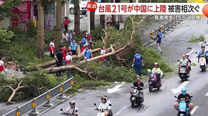中国では、台風21号の影響で大規模な高潮や倒木被害が相次いだ。中国メディアによると、これまでに広東省内で約15万人が避難したという。