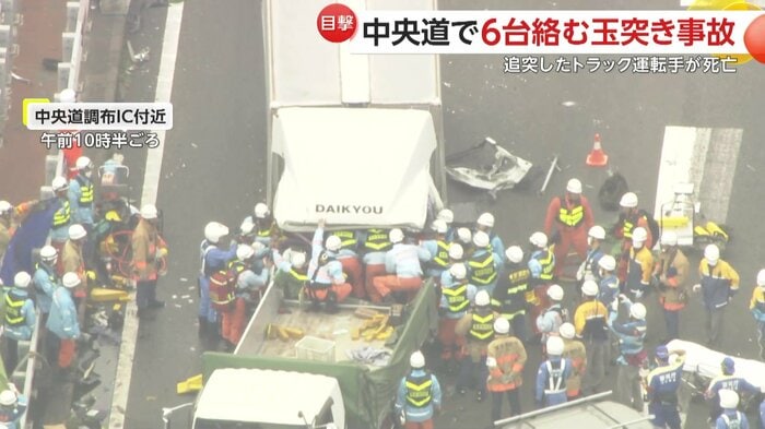 中央自動車道で7日、車6台が絡む事故があり、1人が死亡、6人がケガをした。渋滞の最後尾にいたトラックに別のトラックが追突し、その勢いで前方の乗用車などを次々と巻き込んだという。