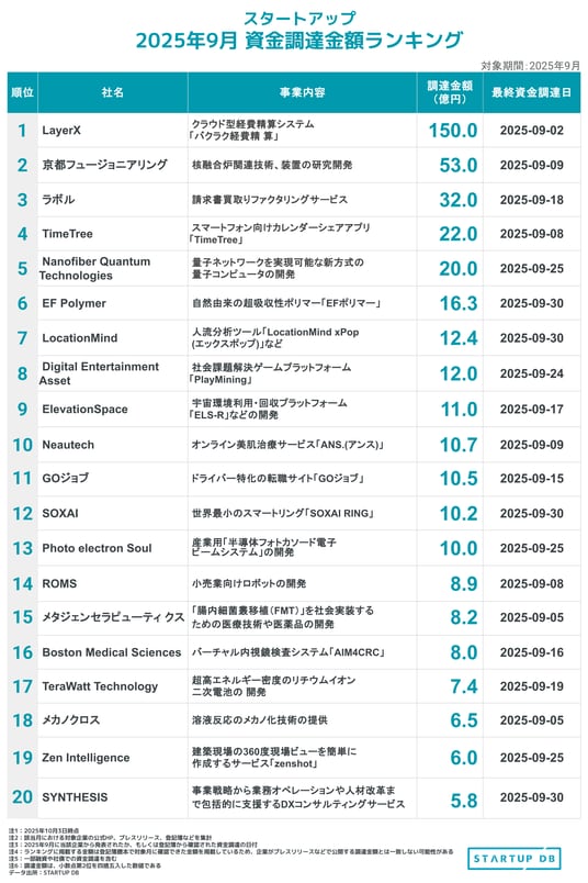 ・レポート記事:STARTUP DB (https://journal.startup-db.com/articles/funding-ranking-202509)