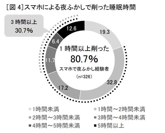 また、スマホでの夜ふかしでどれくらい睡眠時間を削ったかと聞くと、「1時間~2時間未満」(32.8%)と答えた人が多く、全体の約8割が「1時間以上」(80.7%)、約3割が「3時間以上」(30.7%)の睡眠時間を削っていることが分かりました[図4]。