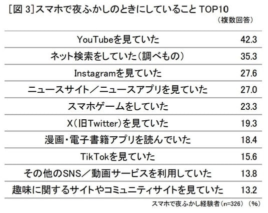 スマホの利用で夜ふかしをした経験がある326人に、何をしていて夜ふかしをしたのかを聞きました。すると、「YouTubeを見ていた」(42.3%)、「ネット検索をしていた(調べもの)」(35.3%)、「Instagramを見ていた」(27.6%)が上位に挙げられました[図3]。