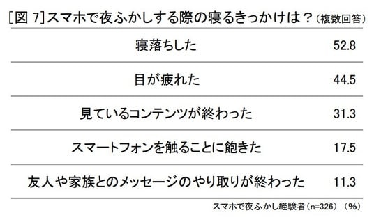 スマホによる夜ふかしで翌日の悪影響を痛感しているからか、スマホ利用での夜ふかしをしながらも「本当は寝なければ」と感じている人が86.8%と大多数を占めています[図6]。とはいえ、スマホの利用で夜ふかしをする際の寝るきっかけを聞くと、「寝落ちした」(52.8%)が最も多くなっています[図7]。