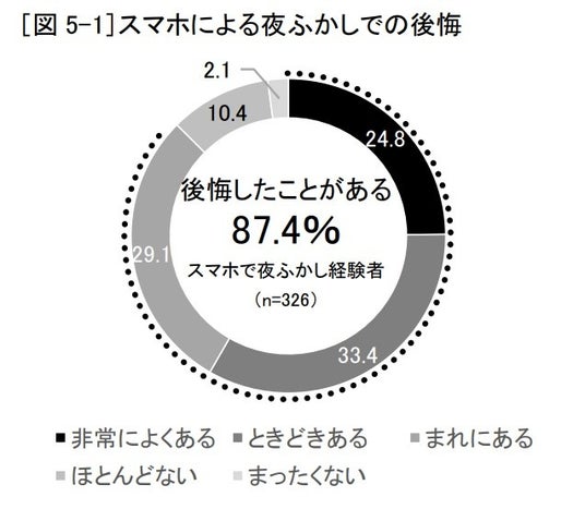 スマホ利用の夜ふかしで後悔した経験を聞くと、なんと87.4%もの人が「後悔した」と回答しています[図5‐1]。後悔しつつも、ついついスマホの利用で夜ふかしをしてしまっているようです。