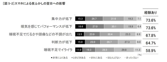 また、スマホによる夜ふかしの翌日への影響について聞くと、7割以上が「集中力が低下」(73.6%)したり、「眠気を感じてパフォーマンスの低下」(73.6%)した経験があると答え、「睡眠不足でだるさや頭痛など身体的な不調が出た」(67.8%)を訴える人も6割を超えています[図5-2]。このような影響を実感しながらもなかなかやめられない…。スマホによる夜ふかし問題の根深さが垣間見える結果です。