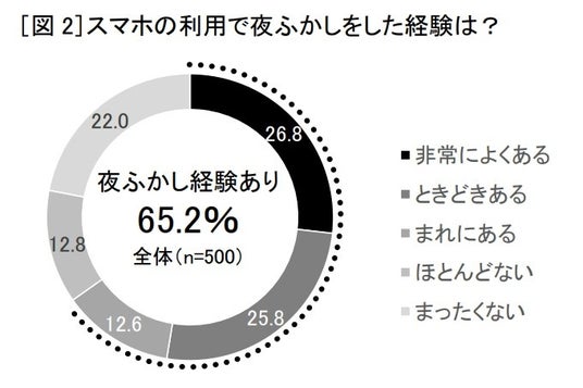 また、スマホの利用で夜ふかしをした経験を聞くと、「非常によくある」(26.8%)、「ときどきある」(25.8%)、「まれにある」(12.6%)となり、全体の65.2%がスマホの利用で夜ふかしを経験しています[図2]。