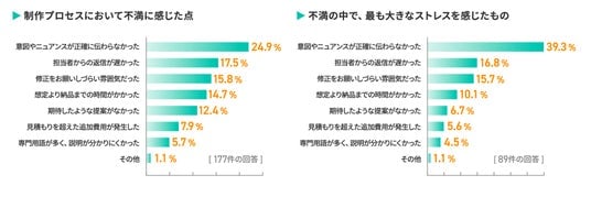 デザイン外注における不満点として、「担当者からの返信が遅かった」(16.85%)と「想定より納品までの時間がかかった」(15.73%)が、それぞれストレス要因の第2位・第3位を占めました。