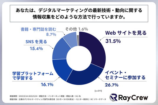 次に、「デジタルマーケティングの最新技術・動向に関する情報収集をどのような方法で行っているか」を尋ねる設問への回答では、1位が「Webサイトを見る」で31.5%、2位が「イベント・セミナーに参加する」で26.7%、3位が「学習プラットフォームで学習する」で16.1%という結果になりました。この結果から、デジタルマーケティングの最新技術・動向に関する情報収集は主に、「Webサイトの閲覧」や「イベント・セミナーへの参加」で行っていることがわかりました。
