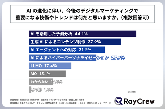 調査の最後、「AIの進化に伴い、今後のデジタルマーケティングで重要になる技術やトレンド」を尋ねる設問への回答では、1位が「AIを活用した予測分析」で44.1%、2位が「生成AIによるコンテンツ制作」で37.9%、3位が「AIエージェントへの対応」で31.2%という結果になりました。この結果から、AIの進化に伴い、デジタルマーケティング部門の責任者が考える今後のデジタルマーケティングで重要になる技術やトレンドで最も多いのは、「AIを活用した予測分析」であることが明らかになりました。