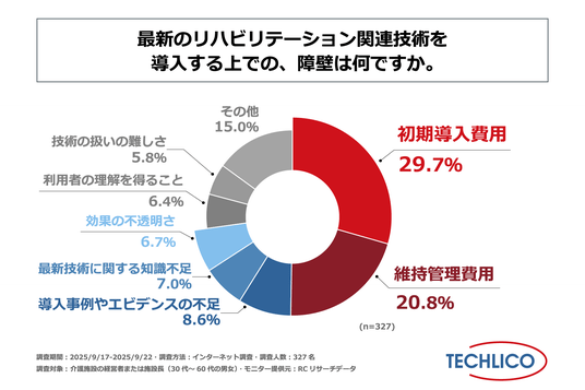 調査の最後、「最新のリハビリテーション関連技術を導入する上での障壁」を尋ねる設問への回答では、1位が「初期導入費用」で29.7%、2位が「維持管理費用」で20.8%、3位が「導入事例やエビデンスの不足」で8.6%という結果になりました。この結果から、最新のリハビリテーション関連技術を導入する上で、介護施設の経営者または施設長が障壁と感じていることは主に、「初期導入費用」や「維持管理費用」であることが明らかになりました。