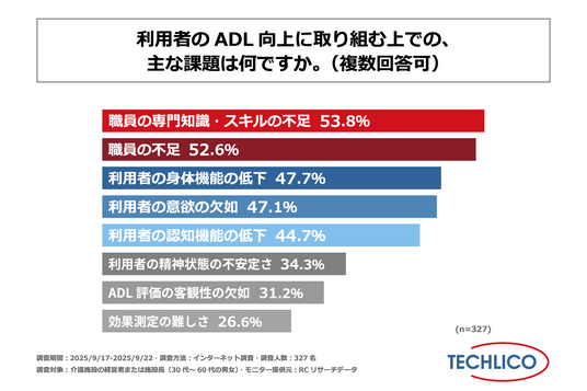 続いて、「利用者のADL向上に取り組む上での、主な課題」を尋ねる設問への回答では、1位が「職員の専門知識・スキルの不足」で53.8%、2位が「職員の不足」で52.6%、3位が「利用者の身体機能の低下」で47.7%という結果になりました。上位2項目はいずれも職員に関することであり、この結果から、利用者のADL向上に取り組む上で、介護施設の経営者または施設長が主に課題としていることは、職員の「専門知識・スキルや人数の不足」であることが判明しました。