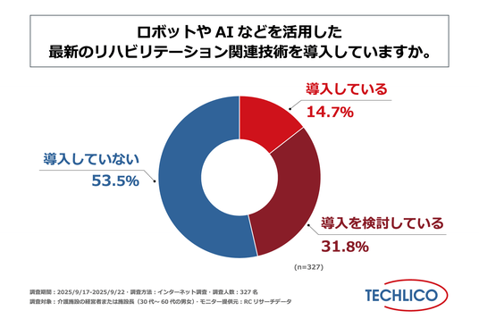 また、「ロボットやAIなどを活用した最新のリハビリテーション関連技術を導入しているか」を尋ねる設問への回答では、1位が「導入していない」で53.5%、2位が「導入を検討している」で31.8%、3位が「導入している」で14.7%という結果になりました。2位と3位の回答を合計すると回答率45%を超える形となり、この結果から、介護施設の経営者または施設長の45%以上が、ロボットやAIなどを活用した最新のリハビリテーション関連技術の導入を検討している、または導入していることが明らかになりました。