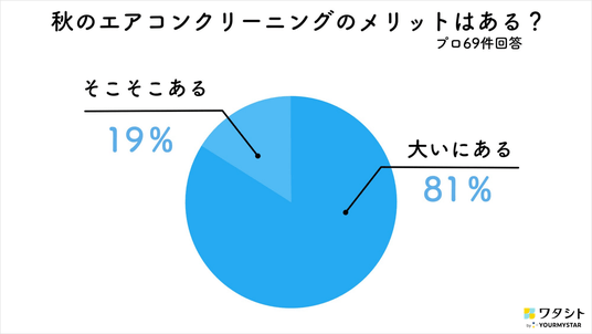 結果は「大いにある」が81%、「そこそこある」が19%となり、デメリットがあるという回答はありませんでした。メリットとしてもっとも多かったのが「夏の間の汚れをリセットできるから」、次いで「暖房を使う前にカビの臭いを予防できるから」という回答でした。「暖房シーズンのエアコン内部のカビを防げる」「エアコンの寿命を延ばせる」といった声もありました。