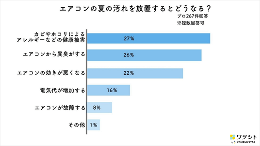 その結果、ハウスクリーニング事業者69名のうち8割が「9月-11月」を推奨しました。酷暑で稼働し続けたエアコンの汚れを放置した場合のリスクについても調査したところ、エアコンの効きの悪化や異臭のほか、電気代の増加やアレルギーなどの健康被害を招くリスクがあることが明らかになりました。