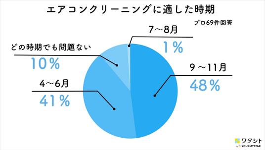 同時に実施したユーザーアンケートでは、エアコンクリーニングを依頼した時期として「4~6月」と「7~8月」が多かったのに対し、プロのハウスクリーニング事業者の見解では、「9~11月」が48%で最多という結果になりました。