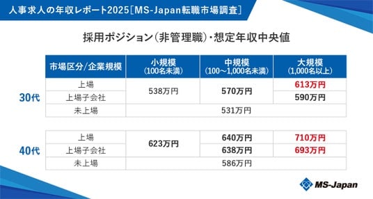 ・30代・中間管理職求人では、中小規模の未上場企業で650万円、大規模上場企業(上場子会社を含む)で753万円