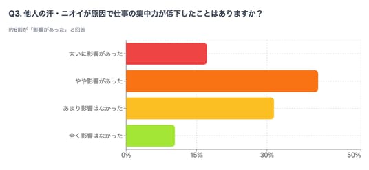 他人の汗・ニオイが仕事の集中力や業務効率に影響を与えたことがあるか調査しました。