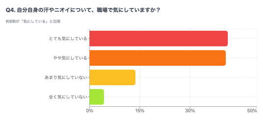 また、約8割の方が自分自身の汗・ニオイも気にしており、他人への配慮だけでなく、自己の印象管理としても関心が高いことが明らかになりました。