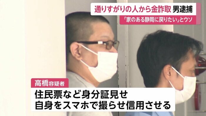 高橋和也容疑者(37)は先月、東京のJR秋葉原駅近くで、通りすがりの人に「家のある静岡に戻りたい。携帯も無くし、帰る金もないのでお金を貸してほしい」などと嘘を言って、5万3千円をだまし取った疑いがもたれている。