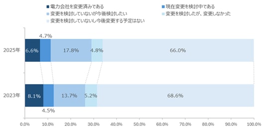 1年以内の電力会社の契約変更に関する検討状況を調査したところ、最も多いのは「変更を検討していないし今後変更する予定はない」(66.0%)となりました。「電力会社を変更済みである」は6.6%、「現在変更を検討中である」は4.7%、「変更を検討していないが今後変更を検討したい」は17.8%となり、約2割が契約変更意向があることがわかりました。2023年と比較すると、「変更を検討していないが今後変更を検討したい」がやや増加しました。