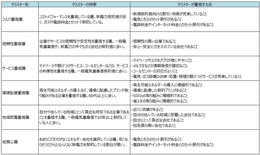 4. 電力会社の選択時の重視点に基づき、消費者を6つのクラスターに分類。コスパ重視層がやや減少