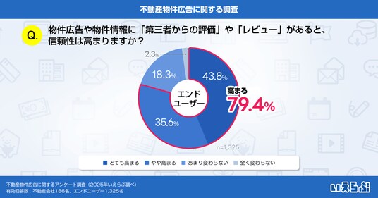 「物件広告や物件情報に口コミやレビューがあった方が信頼性が高まりますか?」という質問では、「とても高まる」(43.8%)、「やや高まる」(35.6%)という回答が約8割を占める結果となりました。