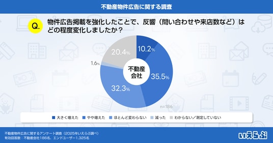 また、「物件広告の掲載を強化したことで、反響(問い合わせや来店数など)はどの程度変化しましたか?」という質問では、45.7%の不動産会社が「増えた」と回答しました。一方で、「ほとんど変わらない」が32.3%、「減った」が1.6%と、変化が限定的なケースも一定数あることが分かりました。
